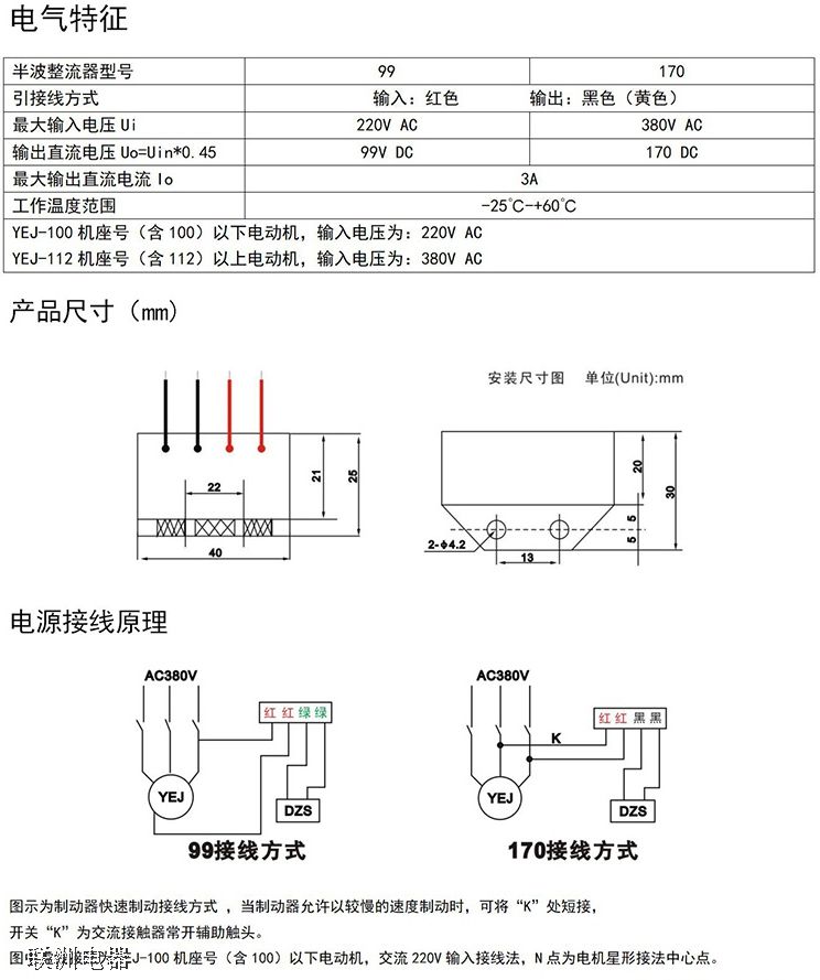 SK2系列整流器主要用于YEJ電磁制動(dòng)三相異步電動(dòng)機(jī)與電磁制動(dòng)器(DHM3系列)的接口。
