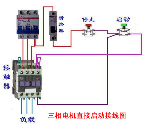 在一般情況下,由公用變壓器供電的三相電機,當(dāng)單機容量小于14千瓦時,允許直接起動。用斷路器、啟動停止按鈕和交流接觸器組合在一起便組成一個Z簡單的直接起動控制線路。例如以下這個三相電機直接啟動接線圖就比較簡單,只要合上開關(guān)接通電源后,按下啟動按鈕,電機就能直接起動、運轉(zhuǎn),按下停止按鈕電機便停止。