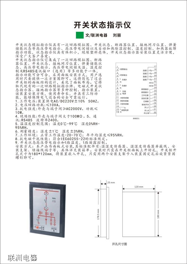 開關(guān)狀態(tài)指示儀產(chǎn)品集成了一次回路模擬圖、斷路器位置、開關(guān)狀態(tài)、接地閘刀位置、彈簧儲能狀態(tài)、高壓帶電指示、高壓帶電電磁閉鎖及溫、濕度控制等多功能于一體,用戶選用時只需提供一次方案圖即可。本產(chǎn)品將取代現(xiàn)有的一次回路模擬指示牌、電磁式開關(guān)狀態(tài)指示器、接地指示器等多種控制、指示裝置。如用戶選配通訊功能,還可將所有開關(guān)狀態(tài)和溫濕度情況上傳至監(jiān)控中心。