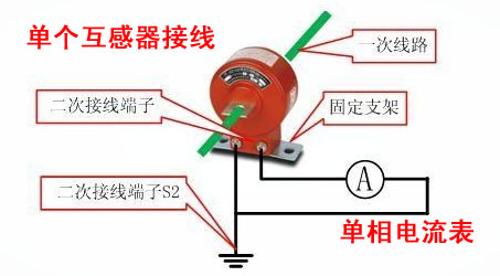 單個互感器和單相電流表接線: